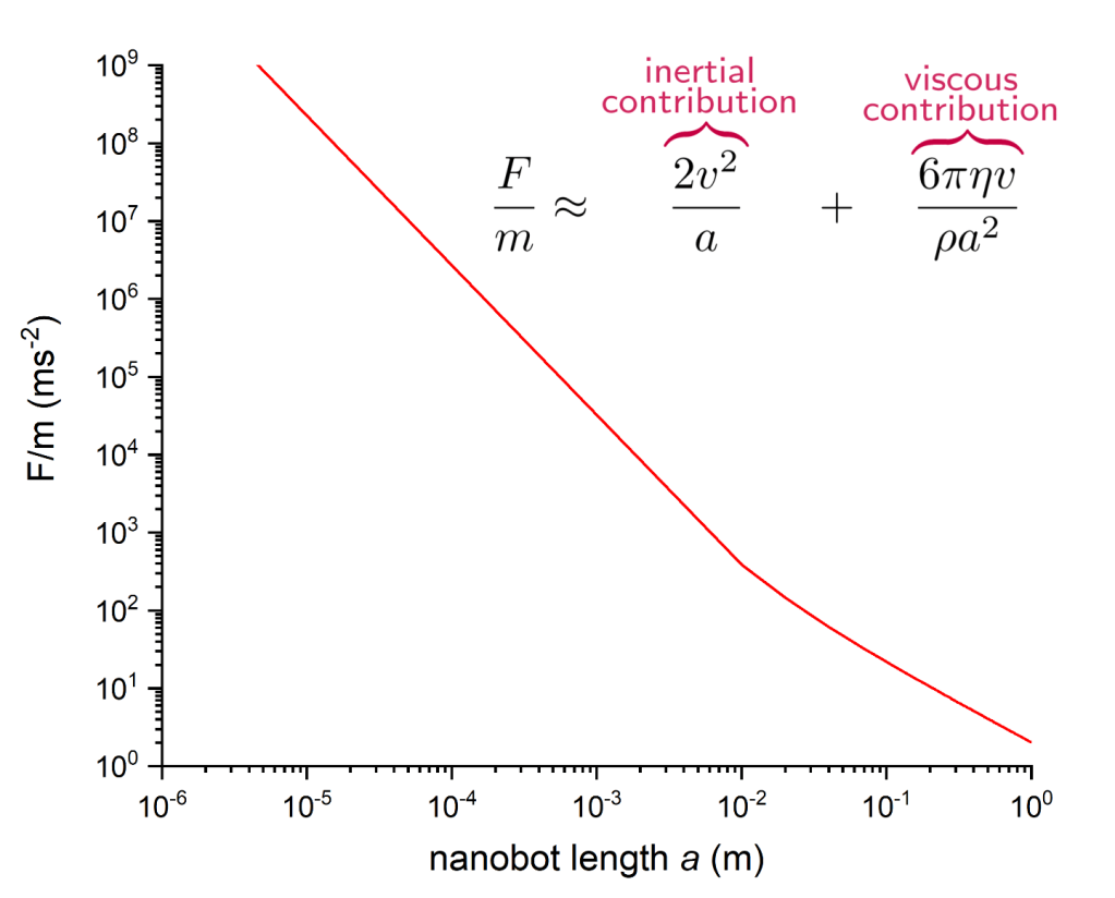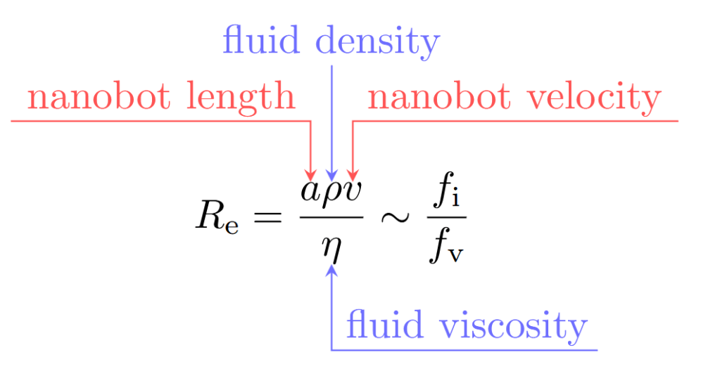 Let’s imagine our nanobot as a submarine scaled down to the size of a red blood cell. Ignoring all mechanical difficulties (e.g. cold welding/ intermolecular attraction of the gears), the engines of our nanobot supply a driving force . As the submarine moves through fluid it feels a resistance force consisting of two contributions; the inertial force